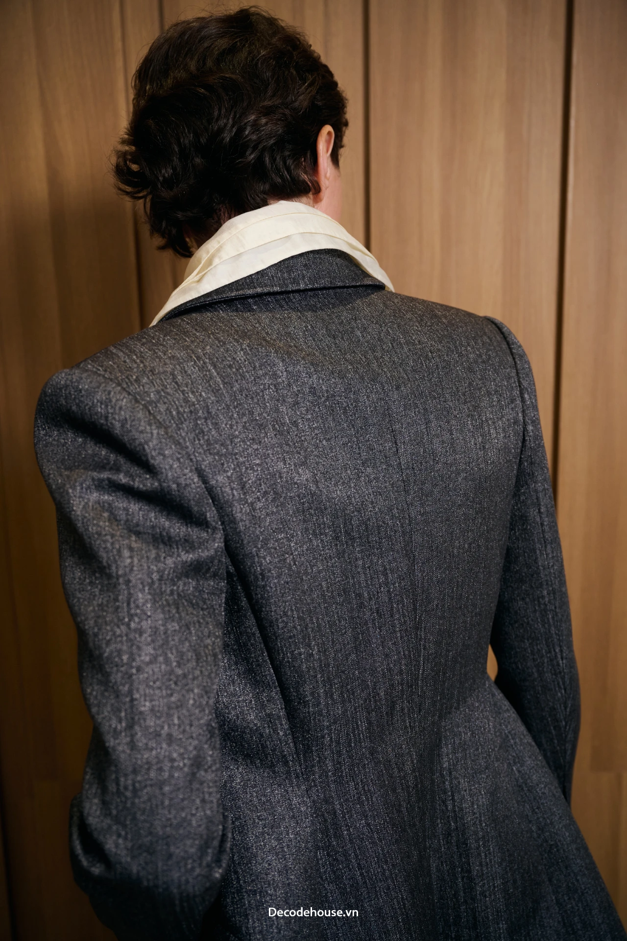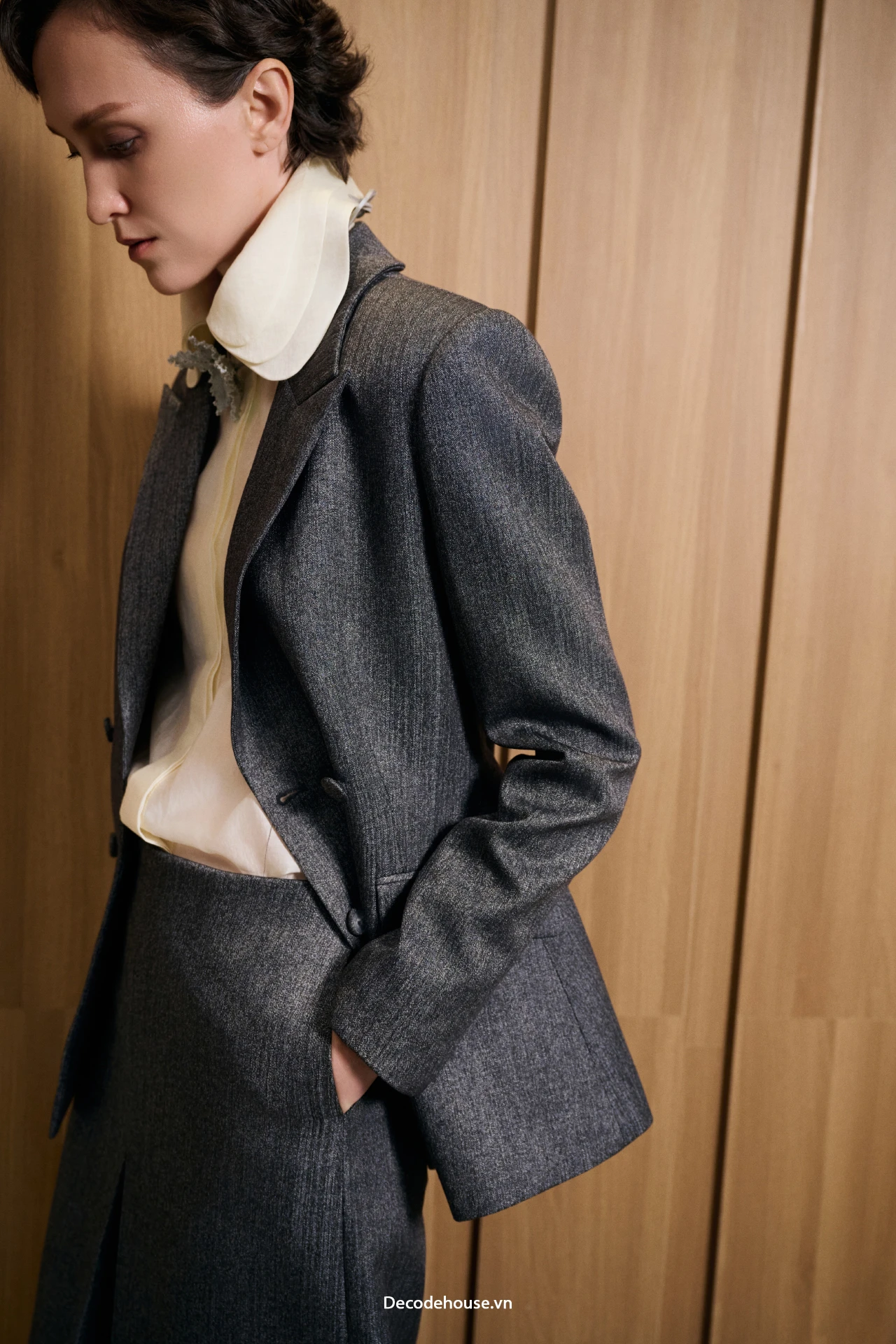 The Cedar Blazer stands out with its ash-grey melange fabric, offering a layered visual effect that feels both classic and contemporary. Its double-lapel tailoring references traditional menswear, softened to flatter the feminine form.