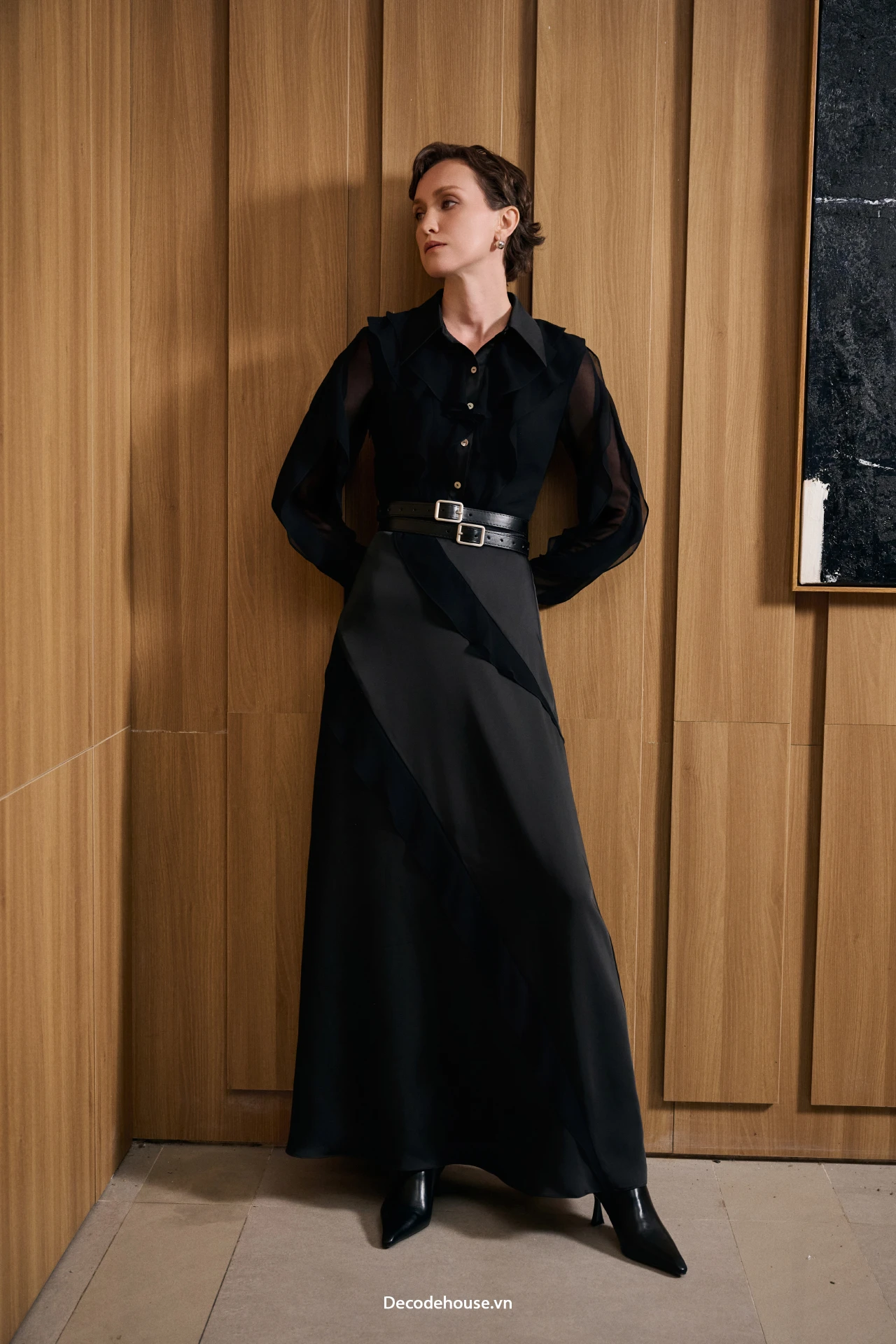 The Eden Dress is a poetic dialogue between chiffon and silk, blending into a mysterious black that reveals layered depths of light and texture. A delicate silk-ruffle tracing down the dress adds fluid femininity against the quiet strength of the silhouette.