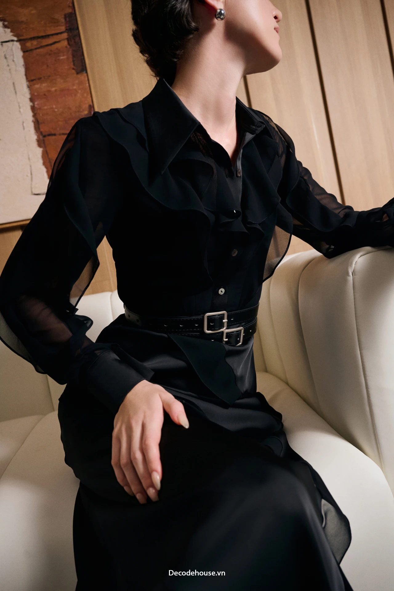 Material: A harmonized mix of sheer chiffon and smooth, light-reflecting silk, creating dimensional richness.